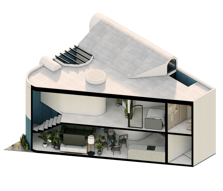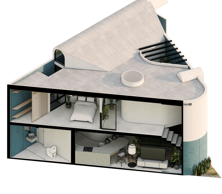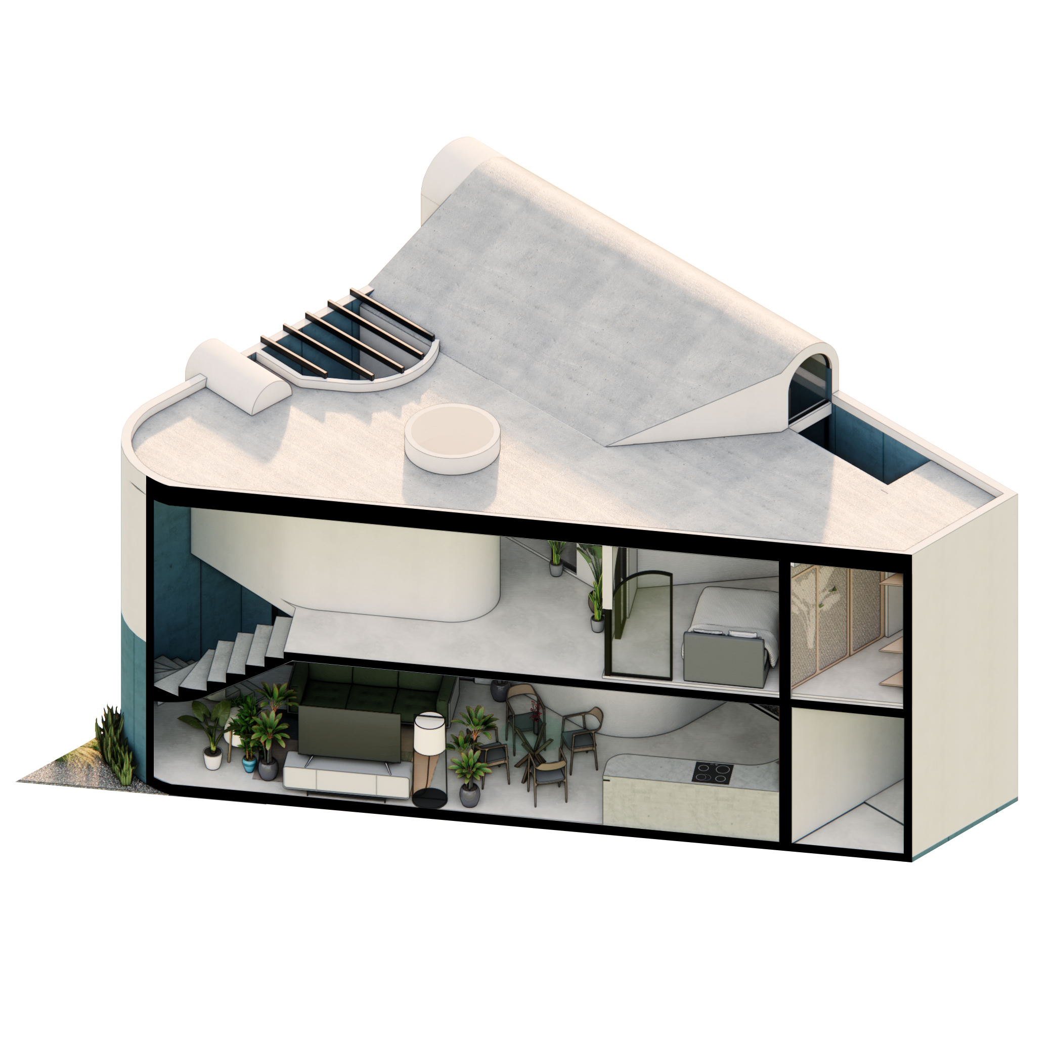 El proyecto "Casa Curva I y II" consiste en el desarrollo de dos viviendas tipo dúplex, que comparten un muro medianero y se desplantan en un predio de traza irregular de 124m². Uno de los retos más sobresalientes fue lograr una superficie construida de aproximadamente 180m² entre ambas, con cada casa ocupando alrededor de 62m² de huella. En este espacio, debíamos brindar la mayor confortabilidad posible.