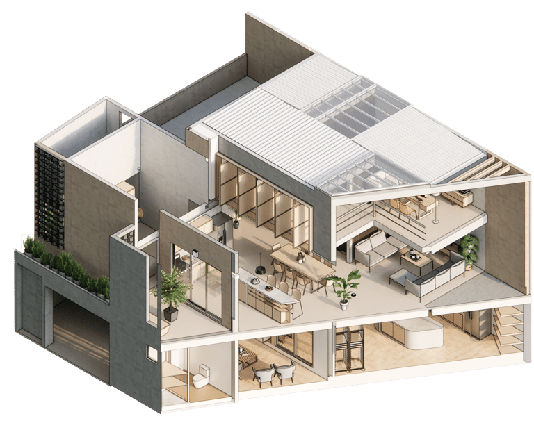 La casa Quebrahacha se desarrolló desde un aspecto introspectivo planteado por el cliente, por lo cual se integró La emancipación de atmosferas biofílicas que concentren pequeños oasis de concentración, admiración, relajación y contemplación de lo que en su interior pudiera privar con grandes muros y barreras de metal como si de un refugio se tratara. La planta baja desempeña un rol de taller de elaboración de galletas, por lo que se generan espacios de guardado de mercancía y un funcionamiento dinámico a través del orden en el proceso, cocción y lavado o depuración, mientras que el primer nivel y segundo son un espacio familiar que proveen iluminación, ventilación y la protección para la familia, pero además espacios recreativos como un patio y una terraza.