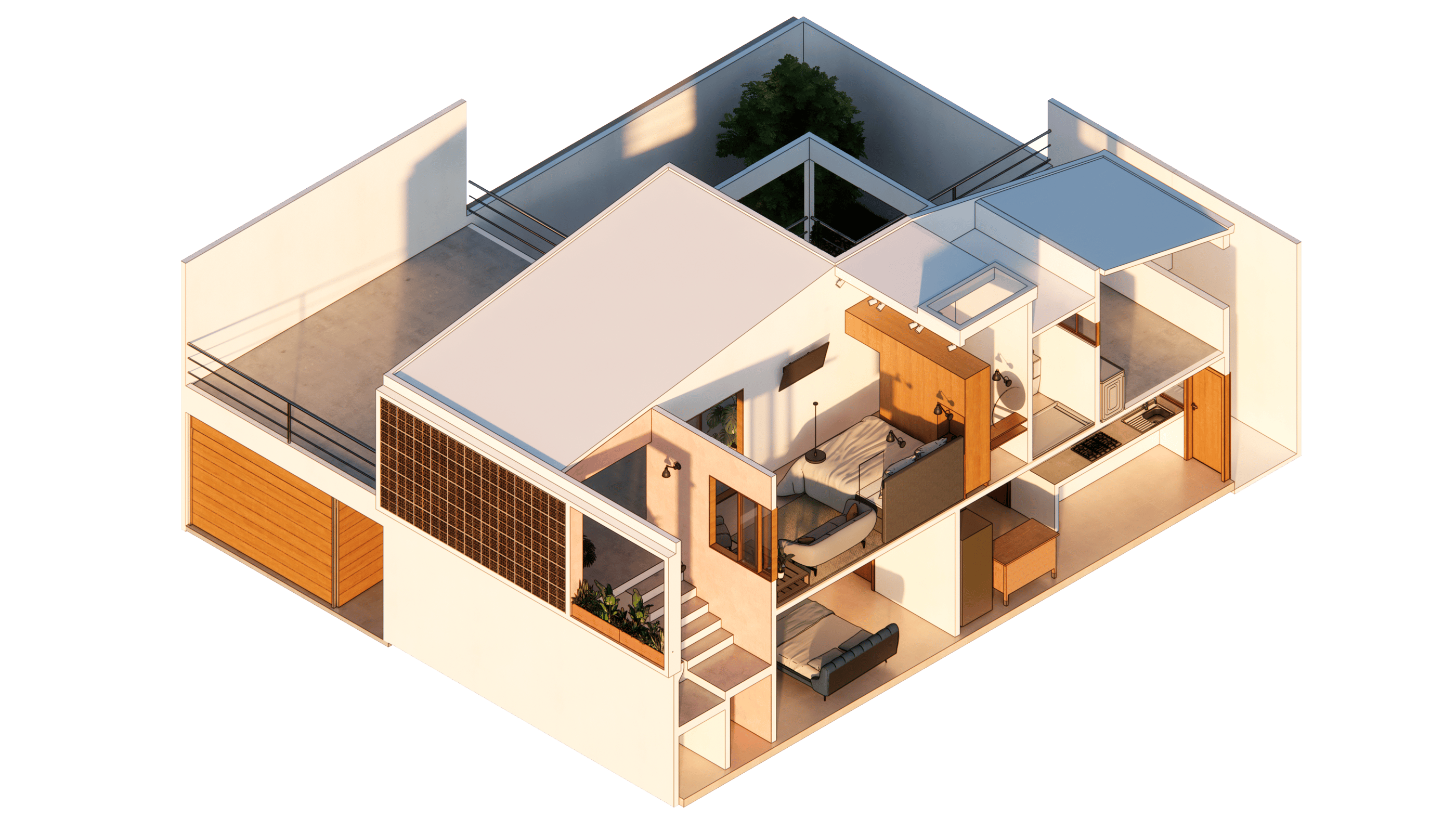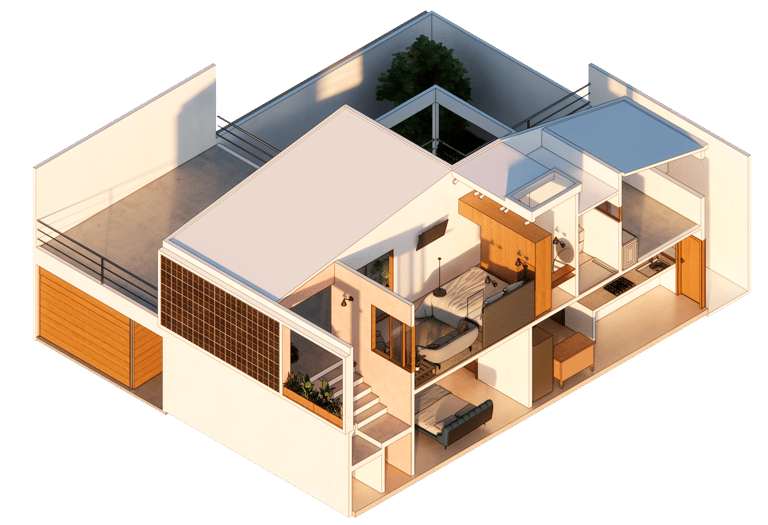 Se trata de una remodelación y ampliación de un primer nivel, la vivienda se encontraba en un lote de 7m x 15m de fondo, sin embargo, la propuesta de ampliación se consideró según los requerimientos del cliente mover la cochera al terreno lateral que recién había adquirido, también se unifi có un solo espacio de sala y comedor; y en el primer nivel se desarrolló un pequeño espacio privado compuesto por una recamara, una sala y un baño. El carácter de la fachada es el resultado de una dicotomía, puesto que una parte era evitar el asoleamiento Poniente y el Sur por el calor, el alto índice de humedad y la sensación térmica en Veracruz, pero se deseaba conservar una vista a un parque ubicado hacia esa misma dirección, así que el resultado fue conservar el vano de la recamara superior continuo hacia la fachada, mientras que la celosía tendría la función de captar luz indirecta y acelerar el flujo de aire a través del efecto Venturi.
