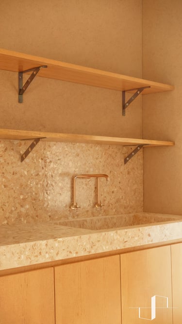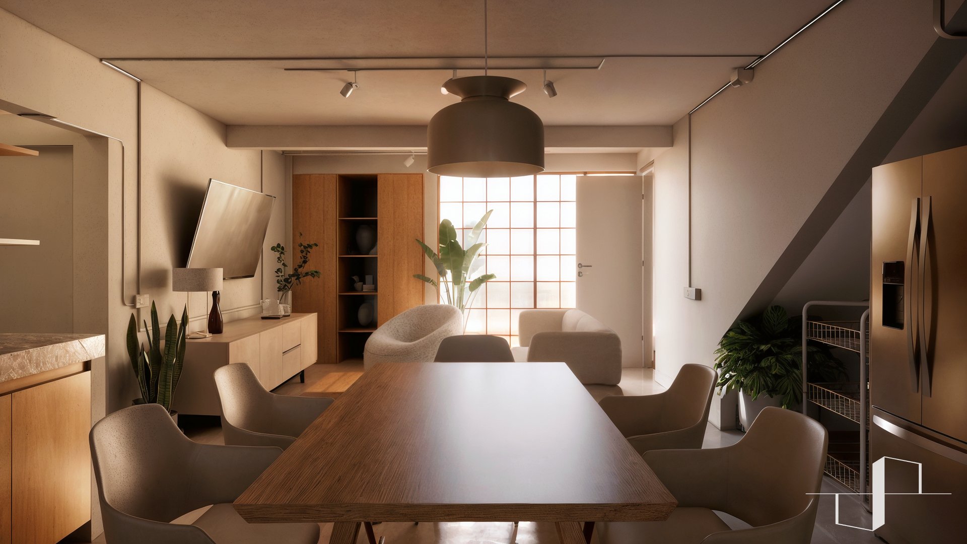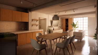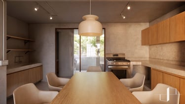 El proyecto se desarrolla en un primer nivel y parte de una planta baja preexistente, cuya estructura original se buscó preservar para generar espacios amplios y continuos. La composición cromática se basa en una paleta cálida que integra madera y acero en tono rojo óxido, en contraste con muros blancos y vegetación colocada en macetas de terracota. Esta combinación crea un ambiente acogedor y armónico para los usuarios.